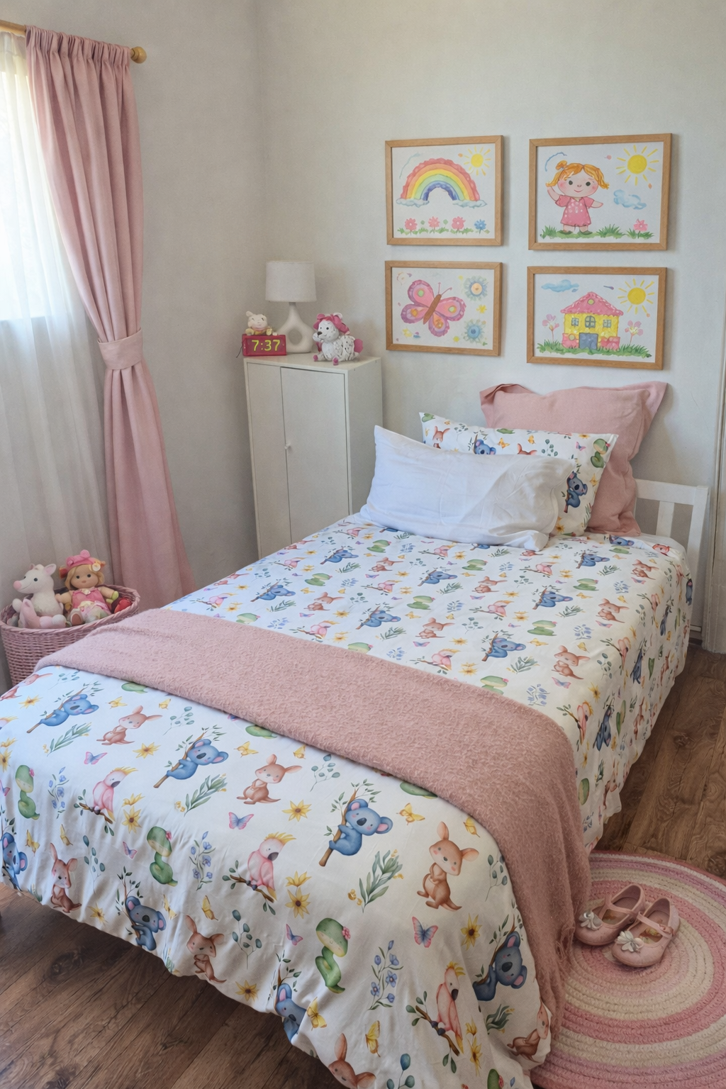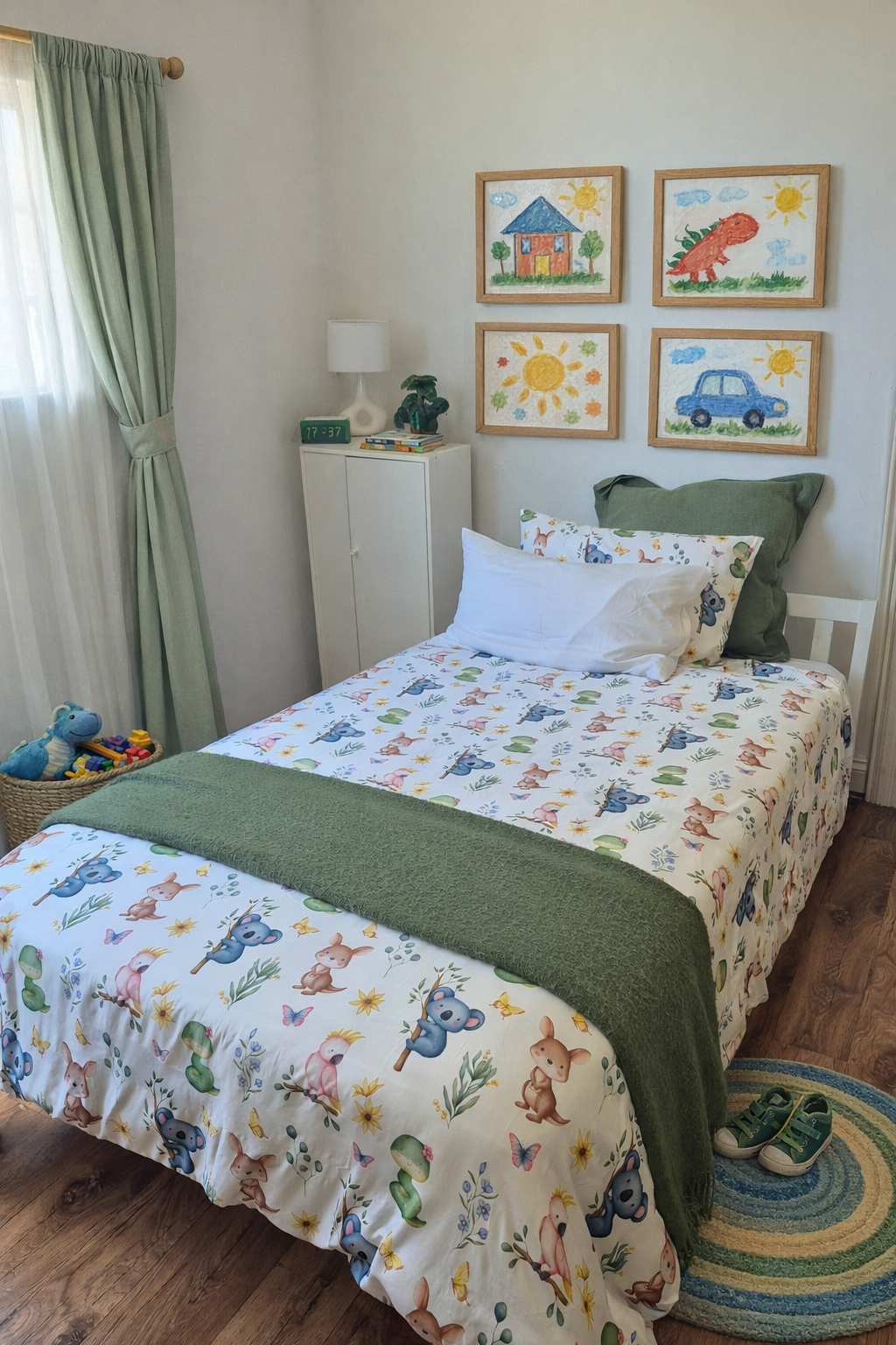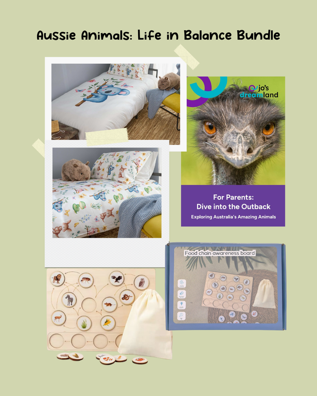 The Aussie Animals: Life in Balance Bundle brings that curiosity into the bedroom through beautifully illustrated organic cotton bedding, paired with a guided booklet and a hands-on food chain awareness game.