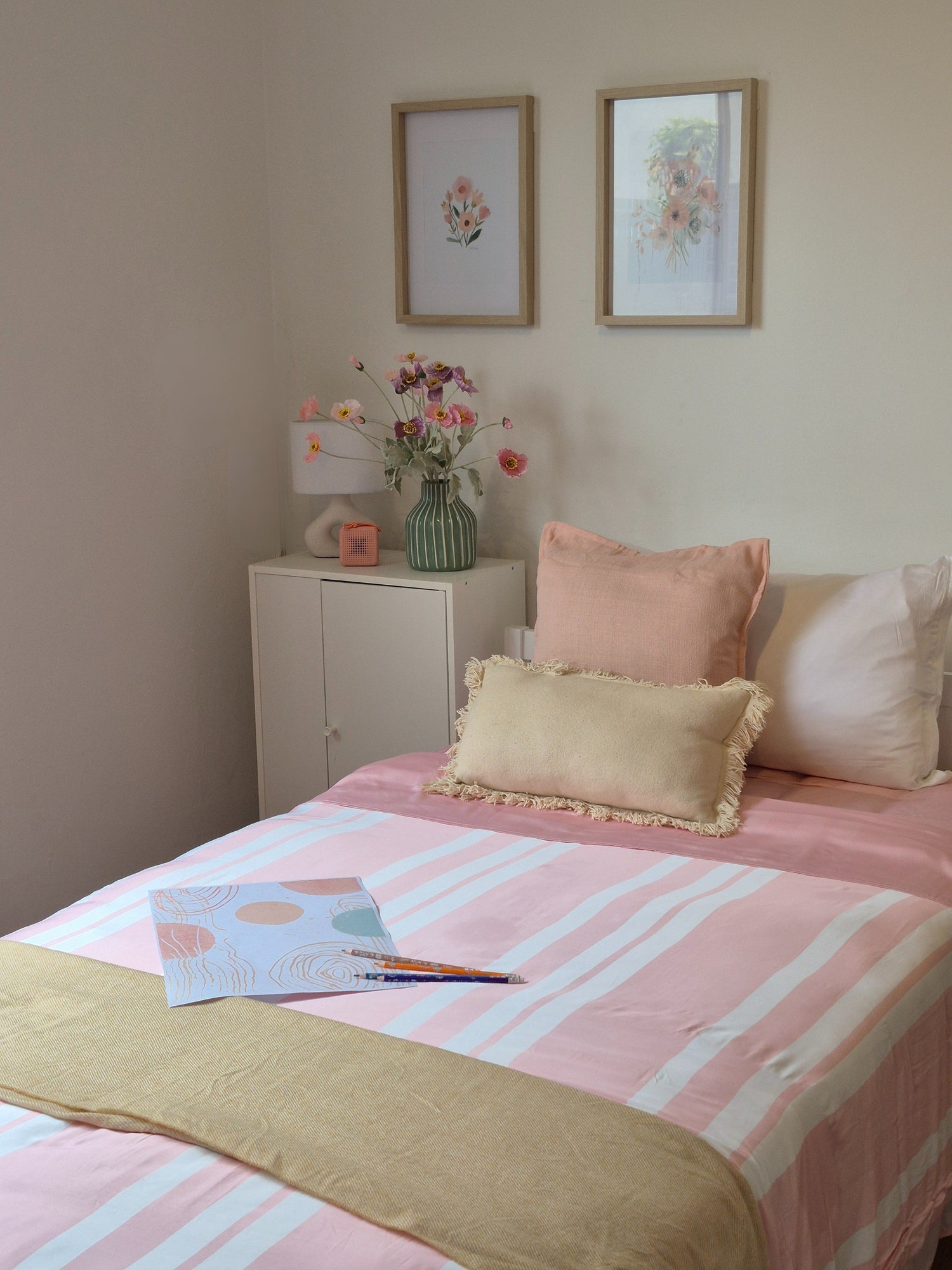One side features soft pink and white stripes, offering a fresh, classic look that feels calm without being plain. The reverse reveals a solid rose quartz Pink, creating a cosy, monochromatic backdrop that helps the room feel settled and ready for rest.
