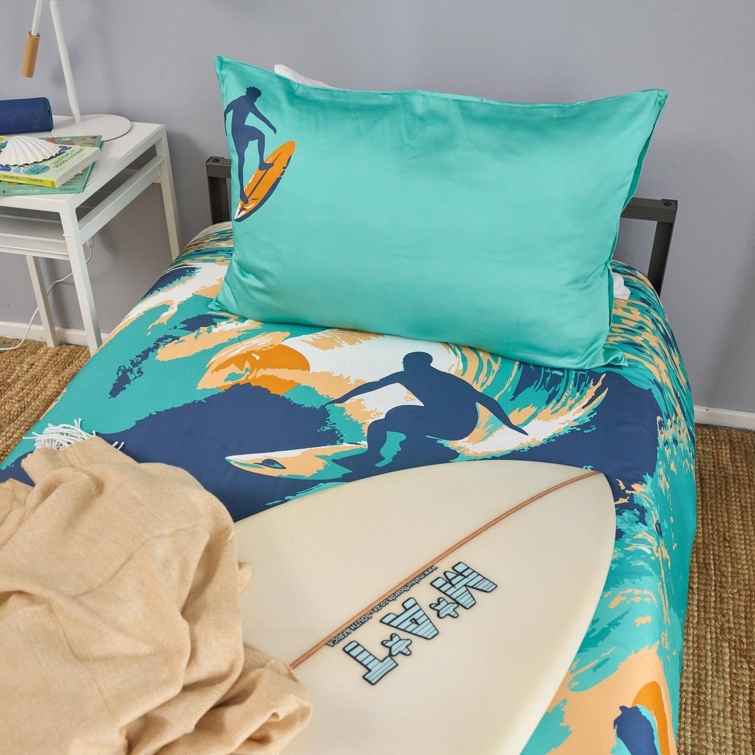 Featuring a retro-inspired illustration of surfers riding waves in a tropical paradise, the design captures the freedom and joy of beach life without overwhelming the space. The solid teal reverse offers a calmer, more restful look, helping the room shift naturally into wind-down mode at bedtime.